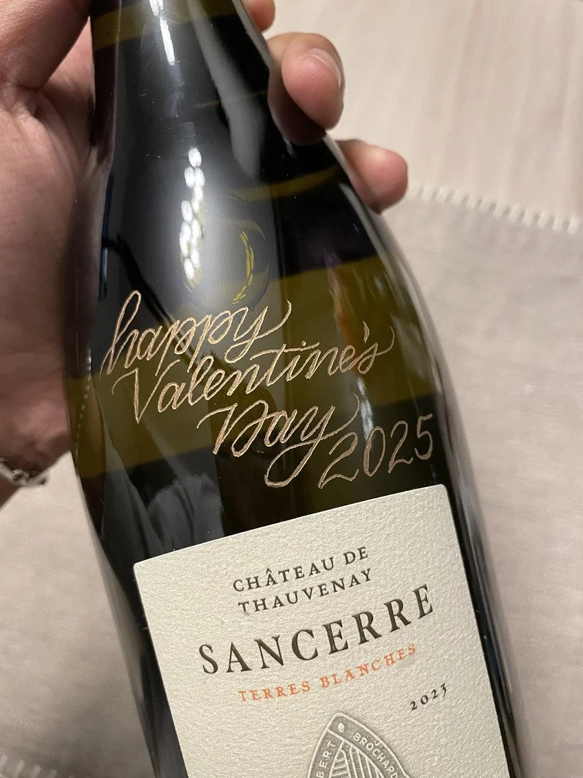 Anything carbonated cannot be engraved due to risk of bottle explosion. Those items are under high pressure and can crack at any moment, making for a dangerous mess! This includes champagne, beer, sparkling wine, sparkling water, and more. Paint pen calligraphy is a great alternative for those items, and the finish is equally as beautiful!